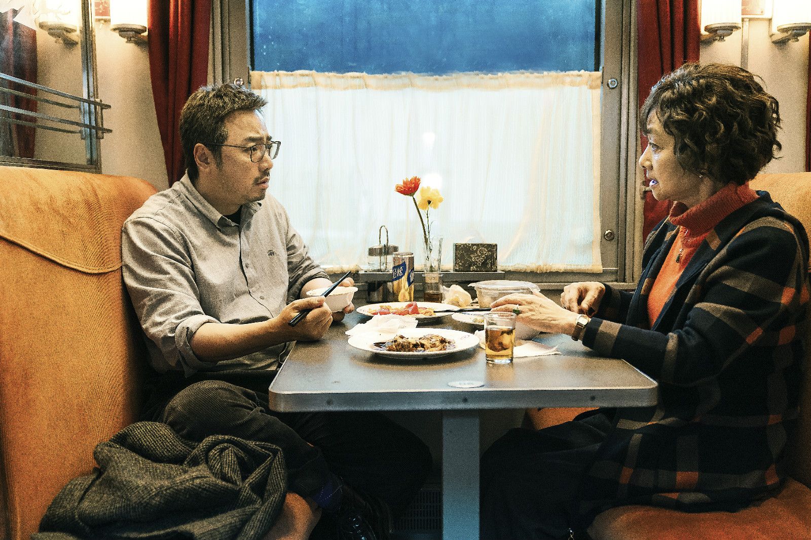 徐峥:这趟K3火车跨过三个国家,当中有无数的车站,这就造成了很多的拍摄困难。我们在俄罗斯租借了三节火车车厢,在火车外面看到的所有的景观则是有一个专门的拍摄团队去拍摄不同的地貌、不同的时间。在摄影棚内我们模拟火车的运动,用灯光制造白天、黑夜、黄昏等等不同时间的光效,再去模拟火车穿过隧道、停车进站、会车等等不同情况,最后再去对照所有我们在外景拍摄的不同景点。所以说电影里90%的镜头都有电脑特效。