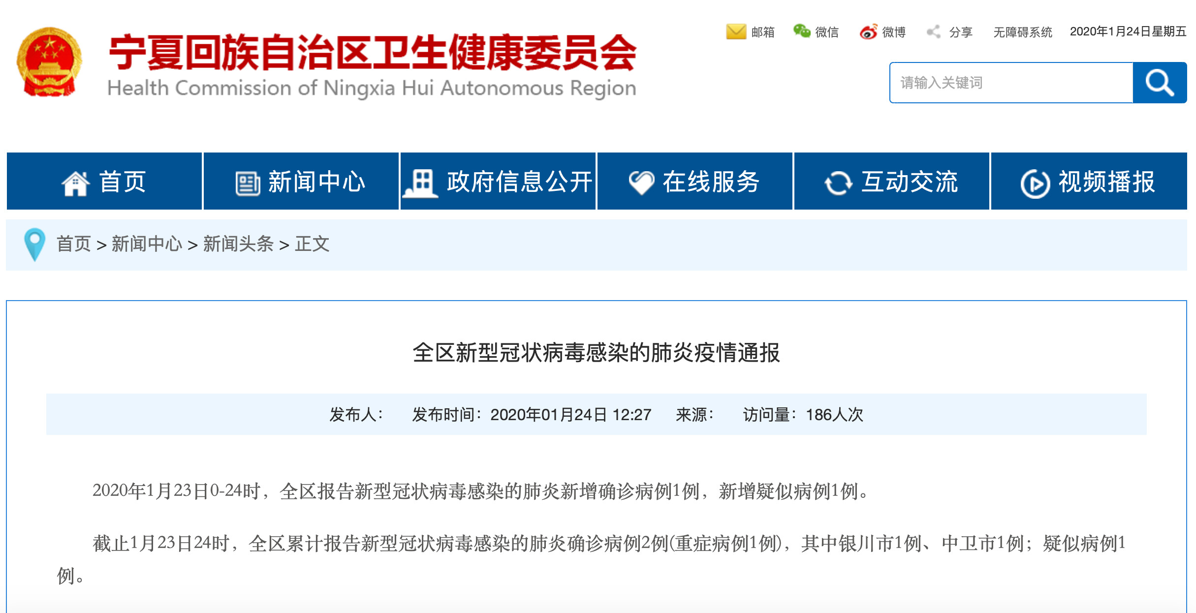 截至1月23日24时,全区累计报告新型冠状病毒感染的肺炎确诊病例2例(重症病例1例),其中银川市1例、中卫市1例;疑似病例1例。