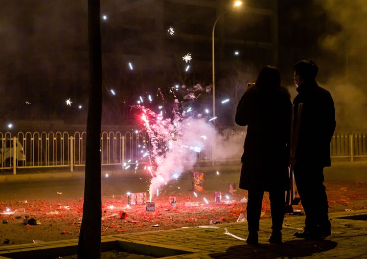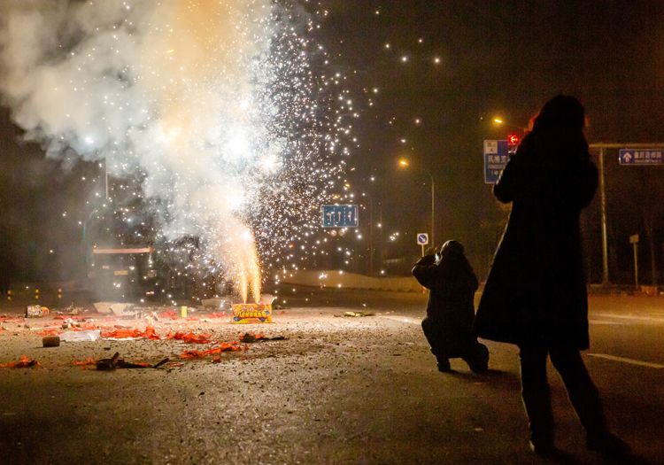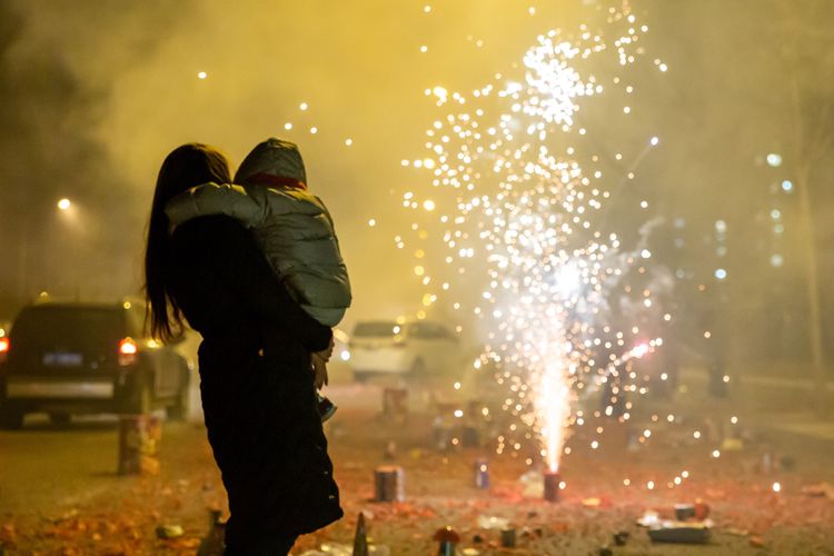 除夕夜,一名母亲陪着孩子欣赏烟花。