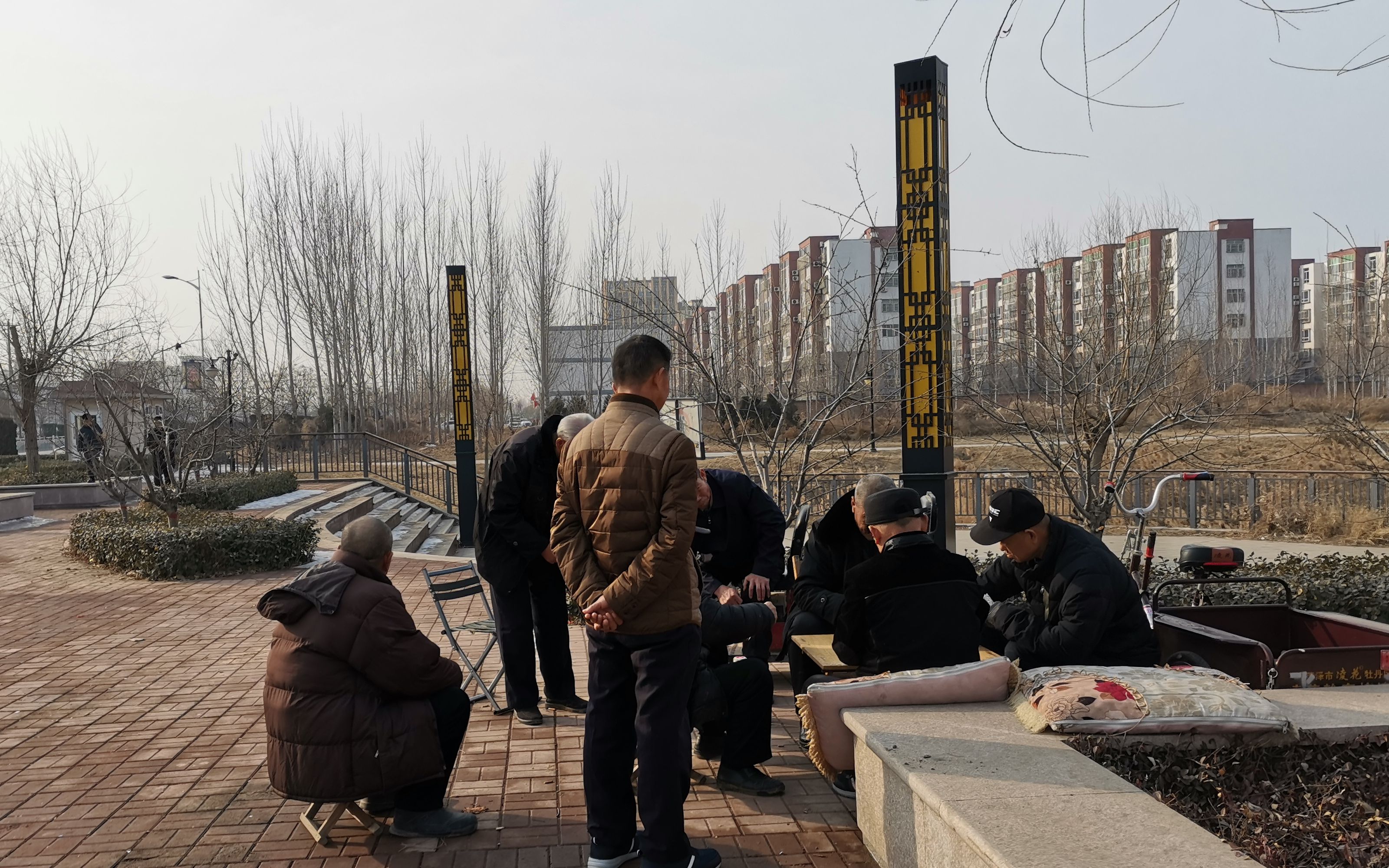1月25日,大年初一下午,县城内某小区附近空地上,八九位老人正在打扑克,均没有佩戴口罩。 新京报记者 韩茹雪 摄