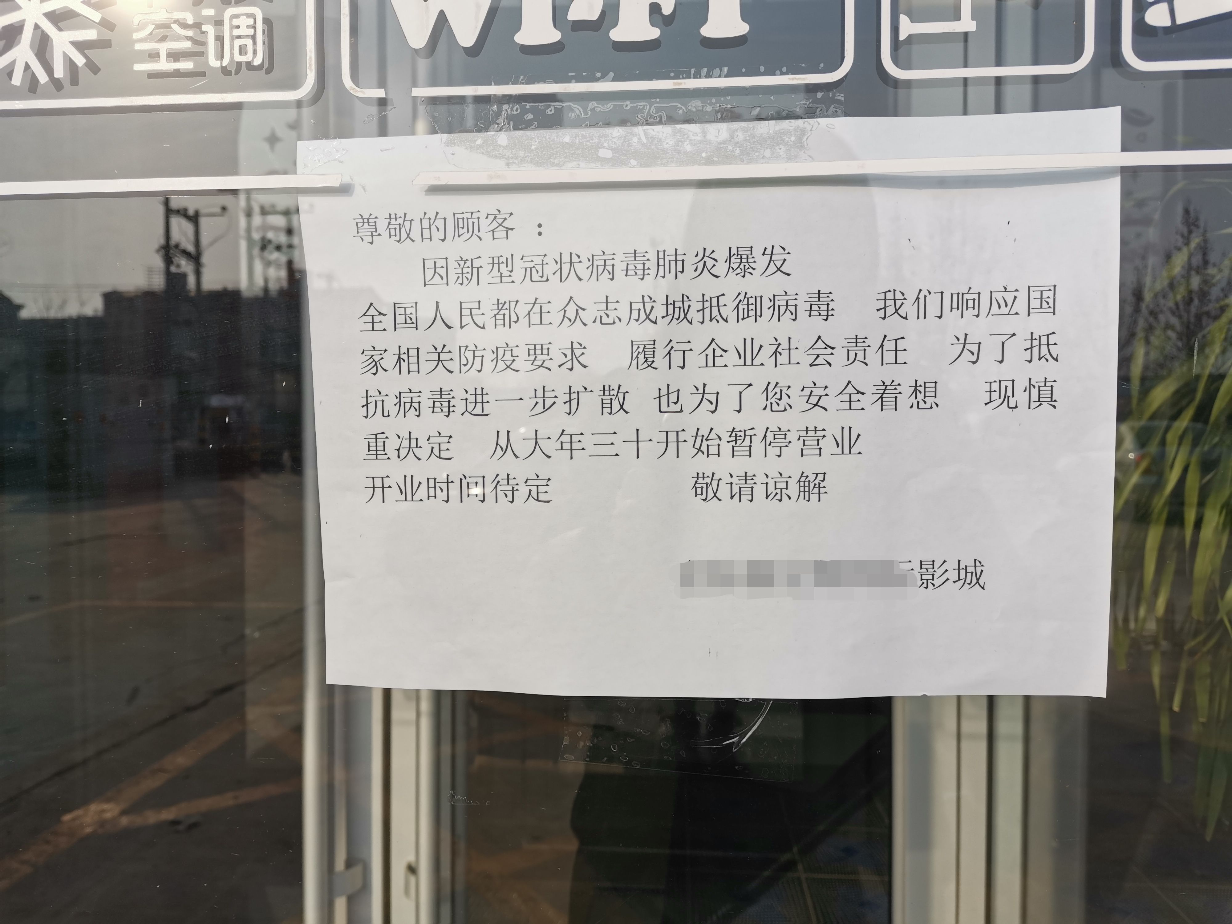 1月25日,县城一家电影院挂出通告,因新型肺炎自年三十暂停营业,开业时间待定。 新京报记者 韩茹雪 摄