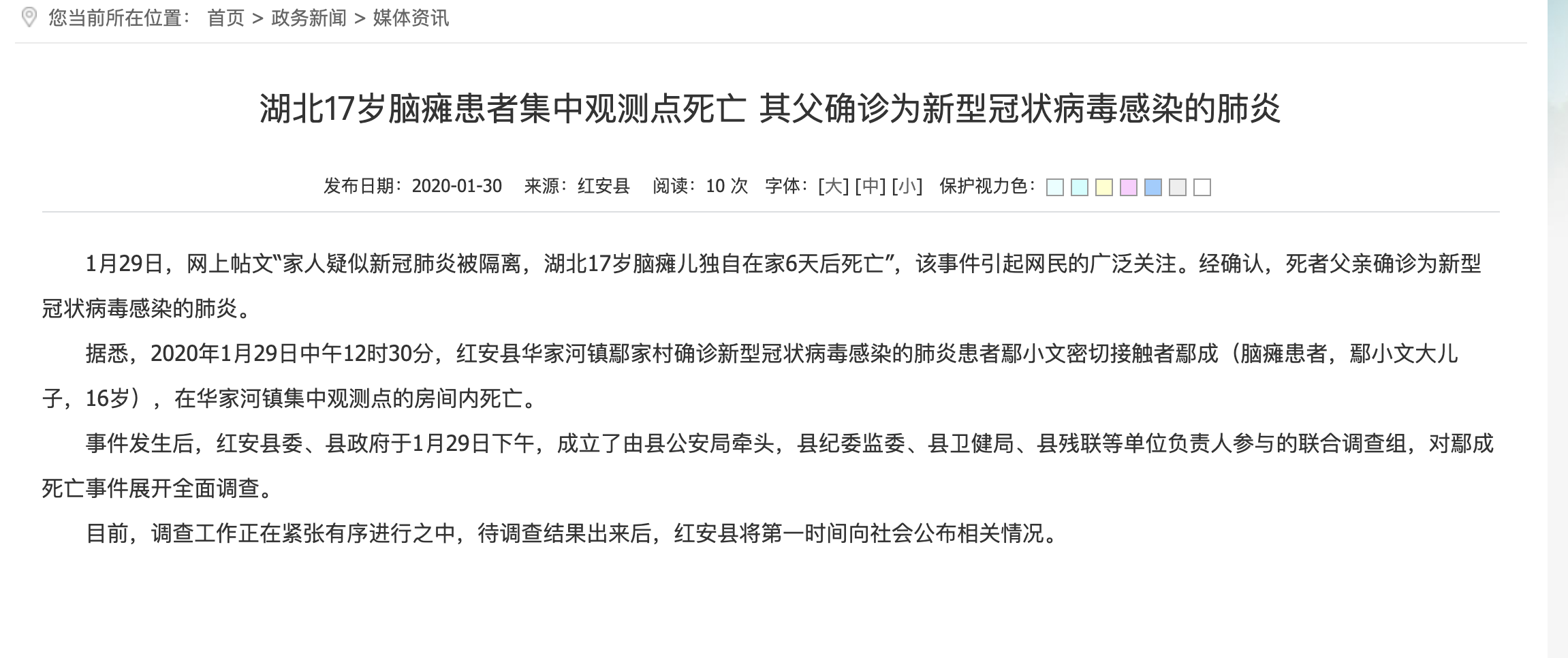 湖北红安一父亲被隔离后脑瘫儿子死亡 当地已成立调查组