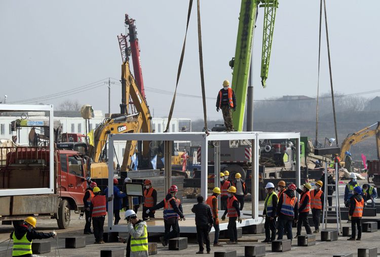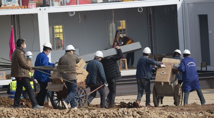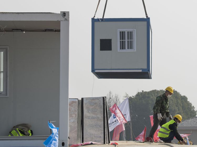 1月30日,武汉火神山医院,工人拼装板房。