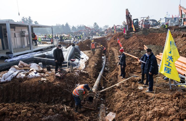 1月30日,武汉火神山医院,工人连接管道。