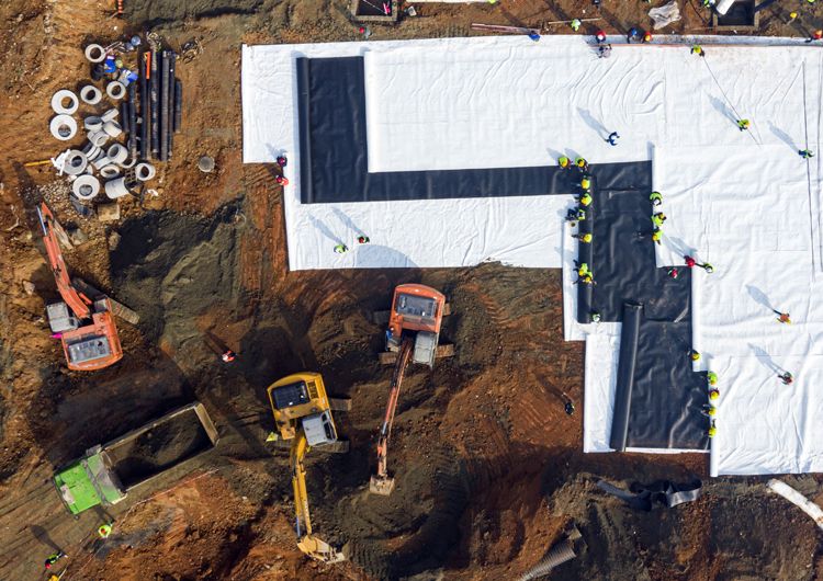 1月30日,武汉火神山医院,工人铺设HDPE膜。