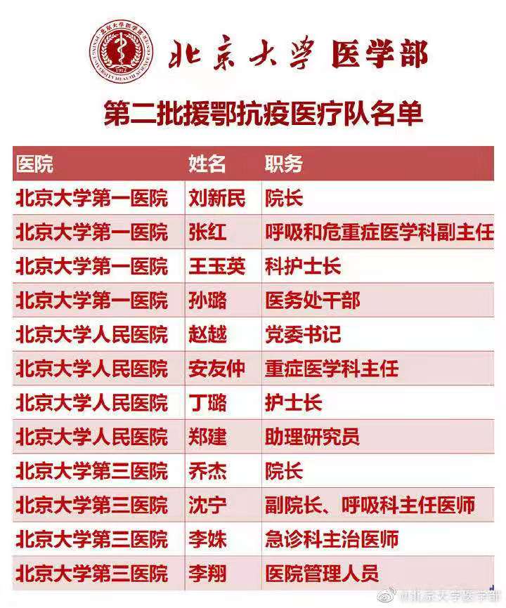 北大医院医疗队由院长刘新民带队,成员包括呼吸和危重症医学科副主任张红、科护士长王玉英、医务处干部孙璐。