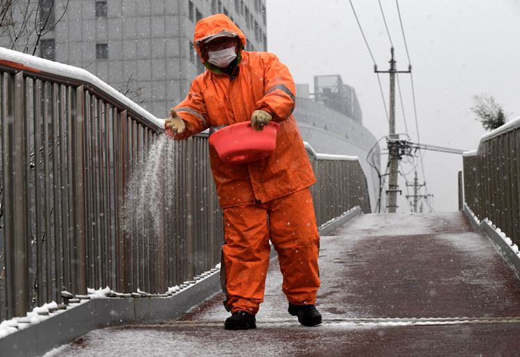 广渠路过街天桥,环卫工人撒融雪剂。