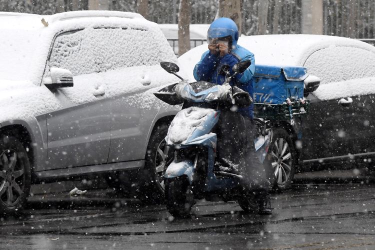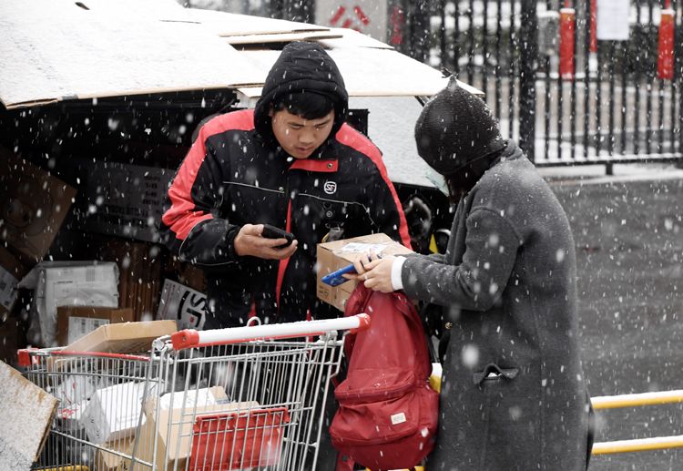 广渠路一小区门口,快递员雪中送快件。
