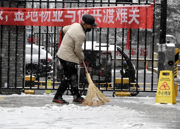 广渠路一小区,保洁员清扫积雪。