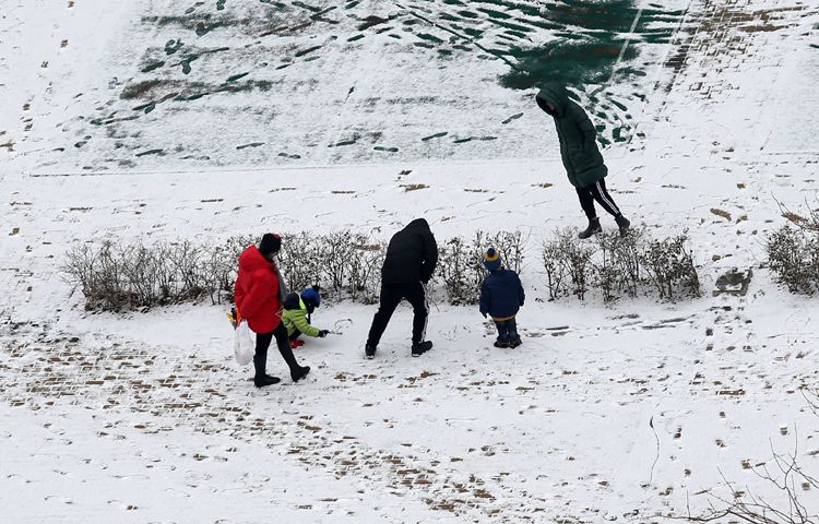 大兴天宫院,家长带着孩子在玩儿雪。