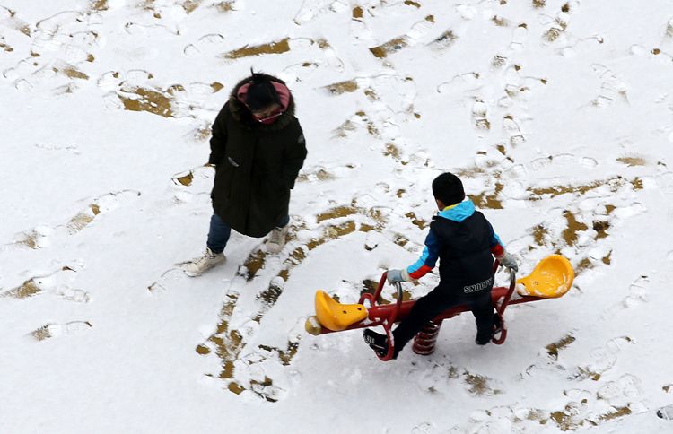 大兴天宫院,雪地上,小朋友在妈妈的陪同下在玩儿跷跷板。