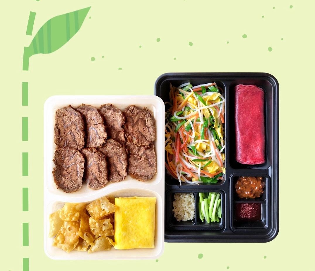 眉州东坡的“立春福饼”套餐包括特别寓意红红火火的红色春饼,配上香卤牛肉、金黄蛋饼以及春季时蔬和香酥的薄脆。顾客可以搜索就近的眉州东坡直接打电话订餐,或者通过外卖平台订餐。