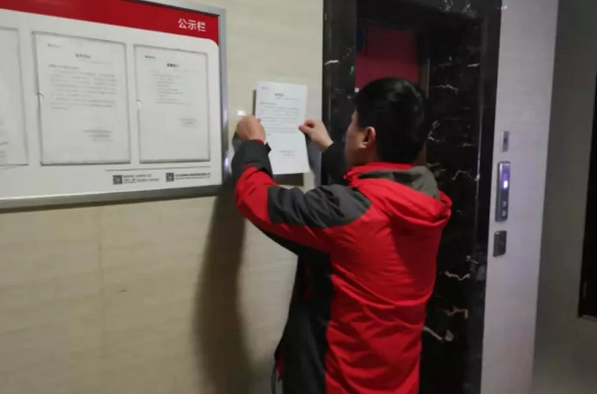 石家庄绿地中山公馆项目物业连夜在社区大堂、电梯间等关键位置,张贴疫情防控的紧急通知,明确疫情期间的物业管理要求,让业主安心、放心。