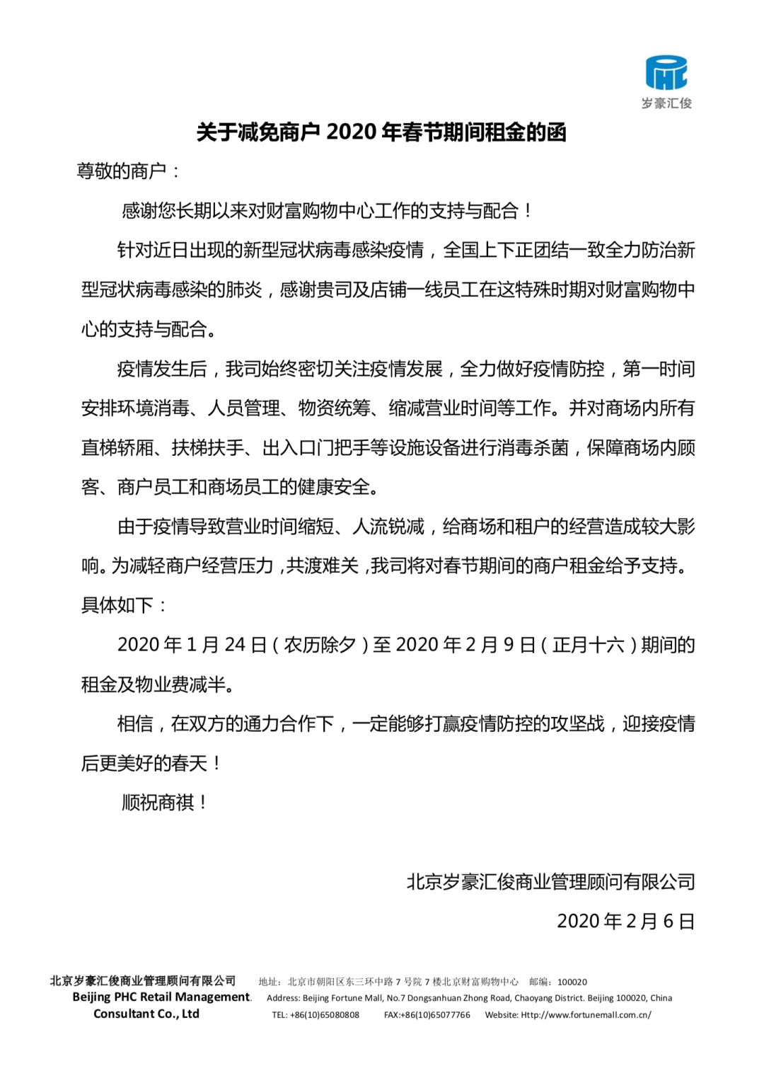 通知表示,由于新冠肺炎疫情导致营业时间缩短、人流锐减,给商场和租户的经营造成较大影响,为减轻商户经营压力,共渡难关,财富中心将对春节期间的商户租金给予支持。减租方案具体如下:2020年1月24日(农历除夕)至2020年2月9日(正月十六)期间的租金及物业费减半。