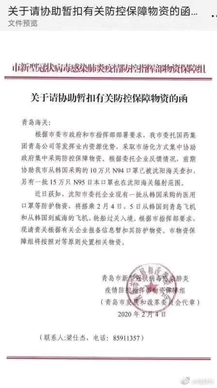 文件中称,“根据市委市政府和市指挥部部署要求,青岛委托国药集团青岛公司等发挥业内资源优势,采取市场化方式集中协助政府集中采购防控保障物资。根据委托企业反馈情况,前期协助青岛从韩国采购的l0万只N94口罩已被沈阳海关查扣,另有一批15万只N95日本口罩也在沈阳海关辐射范围。”