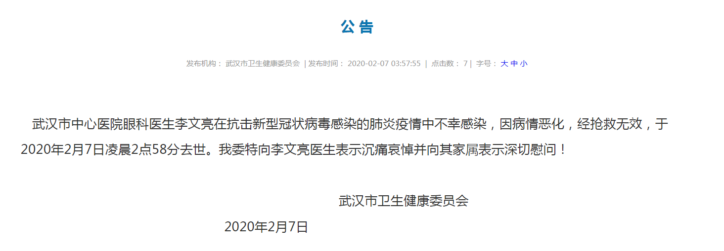 武汉市中心医院眼科医生李文亮在抗击新型冠状病毒感染的肺炎疫情中不幸感染,因病情恶化,经抢救无效,于2020年2月7日凌晨2点58分去世。我委特向李文亮医生表示沉痛哀悼并向其家属表示深切慰问!