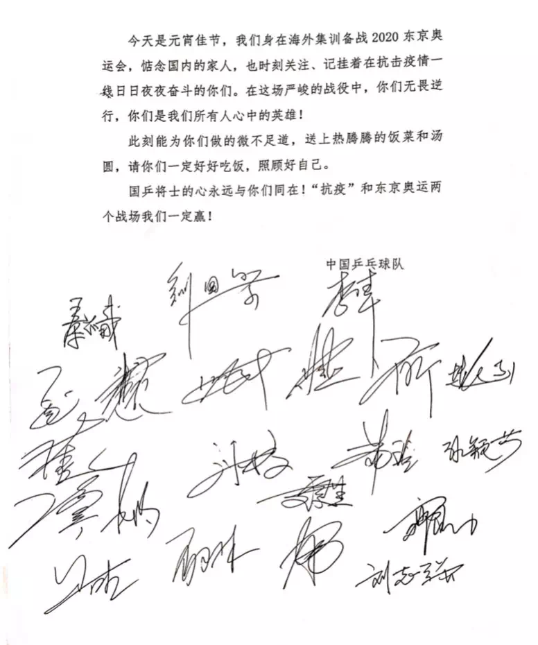 国乒队已与送餐机构达成协议,将持续为前线医生送餐,让一线医护人员能吃到可口的饭菜。