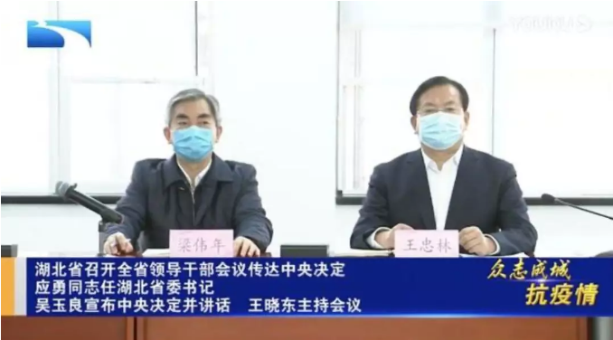 在当日召开的武汉市领导干部大会上,省委书记应勇要求武汉市各级领导干部,以实际行动支持王忠林同志的工作,并提出“湖北人民、武汉人民历史上从来没有被艰难险阻压垮过”,“我们万众一心,众志成城,一定能够取得疫情防控斗争的全面胜利,一定能够打赢疫情防控的武汉保卫战、湖北保卫战。”