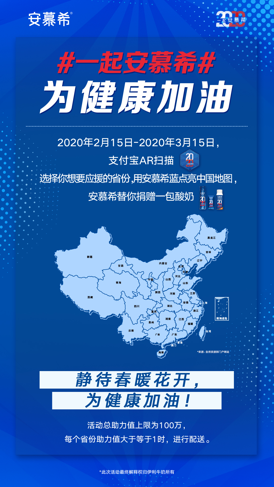 从2月15日起,安慕希发起“一起为健康加油”公益活动。消费者每成功通过支付宝AR扫描安慕希2020标志,并为支持的地区点蓝,安慕希就会为抗疫一线人员送出安慕希产品,将爱心化为实际行动,为战疫一线加油。