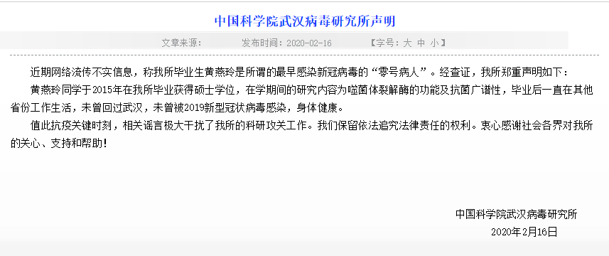 新京报快讯 2月16日中午,针对网上热议的“武汉病毒所一研究生系零号病人”的信息,中国科学院武汉病毒研究所在其官网发布公告。通告全文如下: