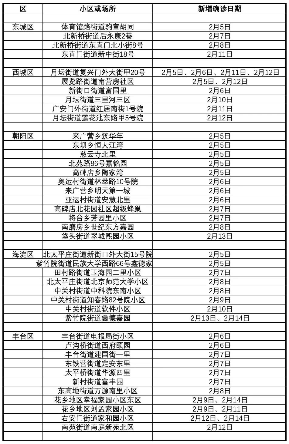 北京2月5日至2月14日新冠肺炎新发病例活动小区或场所