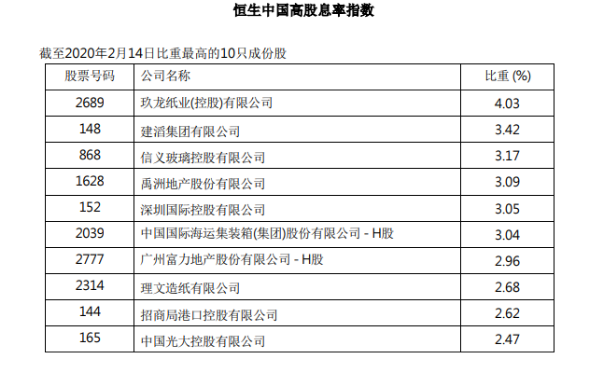 恒生中国高股息率指数的挑选准还显示,要求候选者必须是恒生综合指数大型股及中型股。成交量流通比率大于最低要求的 0.1%;日均成交额达港币 2 千万。