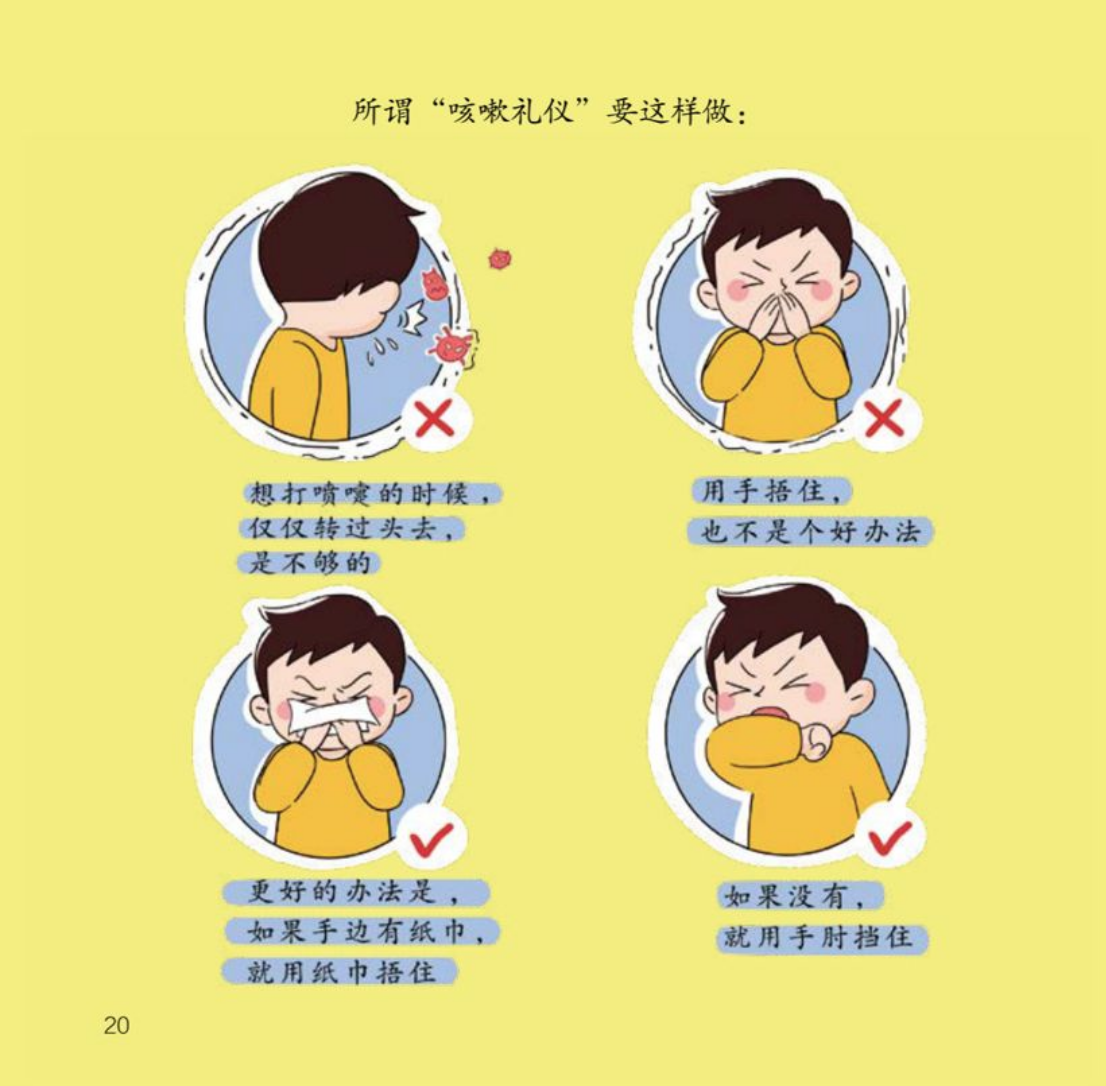 为了避免病毒在咳嗽、打喷嚏时向外喷射,我们要遵守“咳嗽礼仪”。