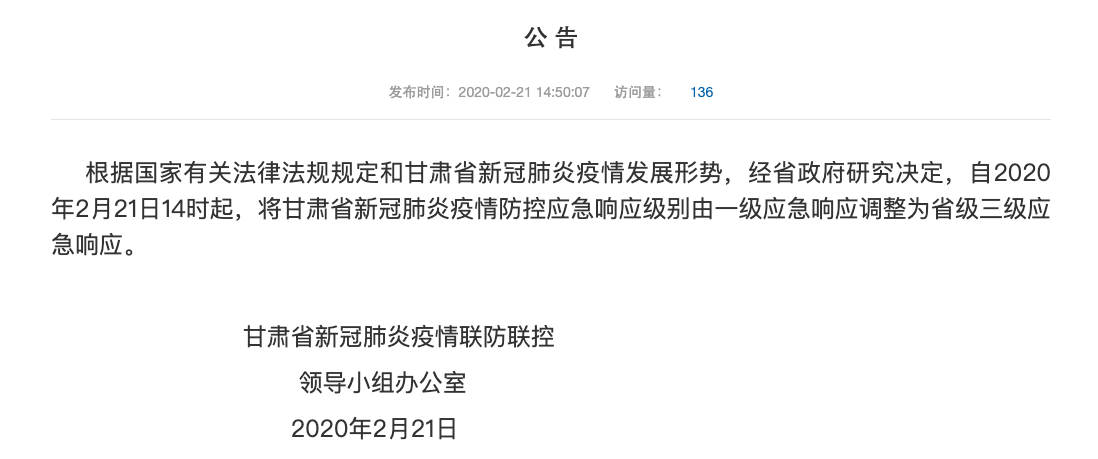 新京报快讯 据甘肃卫健委网站消息,2月21日,甘肃省新冠肺炎疫情联防联控领导小组办公室发布公告,自2020年2月21日14时起,将甘肃省新冠肺炎疫情防控应急响应级别由一级应急响应调整为省级三级应急响应。