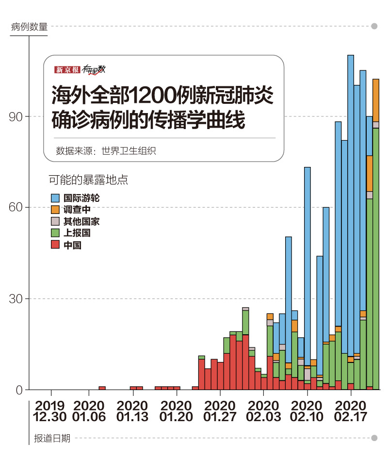 观察世界卫生组织对全球共1200例新冠肺炎确诊病例的统计,很明显看出,自从进入2020年2月,在国际邮轮上染病,和在上报国本国染病的确诊患者,开始占据绝对主体。