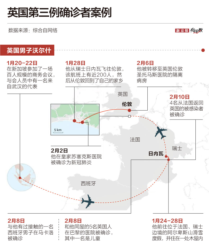 比如下边这位,活动经历特别丰富的英国中年商人沃尔什。他先去了新加坡开会,随后飞去了法国东部的阿尔卑斯山滑雪区度假,和其他人同住在小木屋里,再坐航班飞回到英国伦敦,随后回到家乡小镇,还去家乡酒吧喝酒,直至病发确诊。差不多前后脚,地球上他一路途经的地方都有人被查出新冠肺炎。调查绕了一大圈儿,才搞清楚这些人都是被沃尔什感染的,至少有11人。