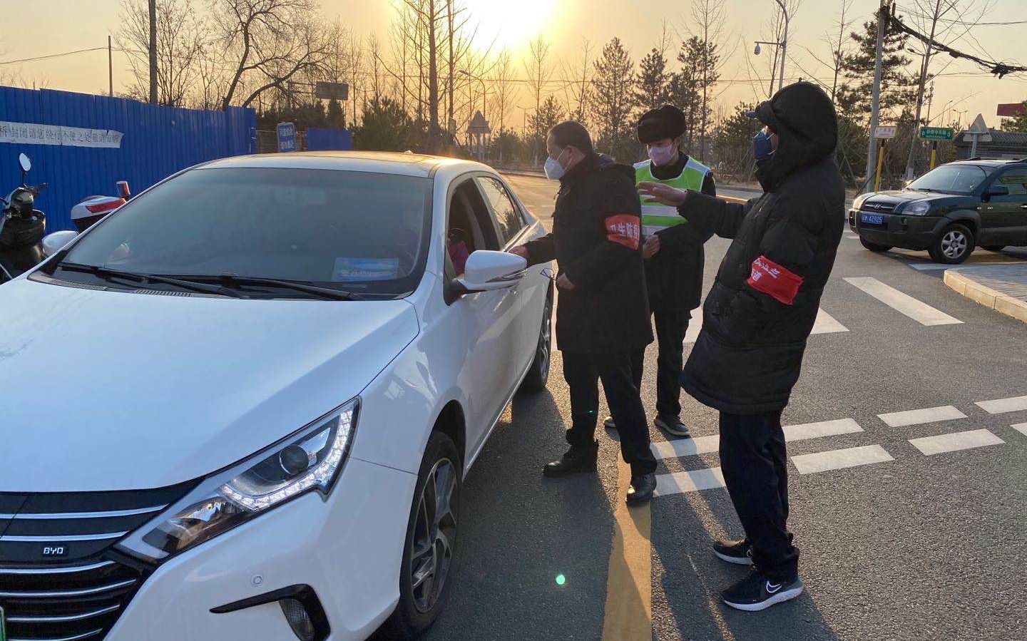 香山街道工作人员在煤厂街、买卖街路口设置防控点位,对进出车辆人员进行体温测量。图源:香山街道