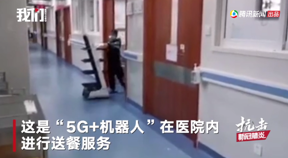 原来是5G机器人在隔离病房上岗工作,它既可以完成送餐任务,也能使用手机APP叫过来回收垃圾。既避免了交叉感染,也缓解了医护人员的工作压力。