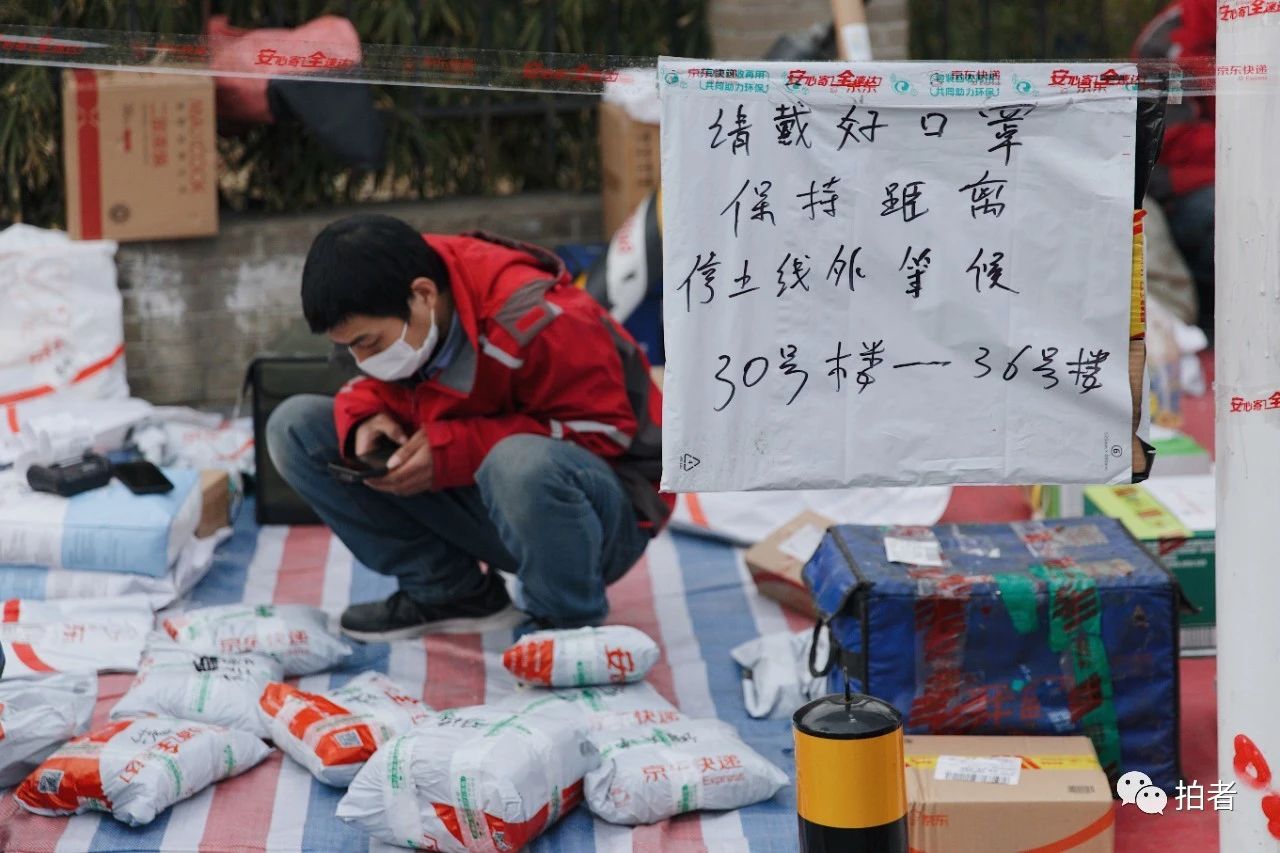 为防控疫情,有的小区封住大小通道,只留一个出入口供居民通行。出入口旁统一立起帐篷,用作返京人员登记及办理出入证。附近另划小区快递统一收取点,待取包裹排列近百米。