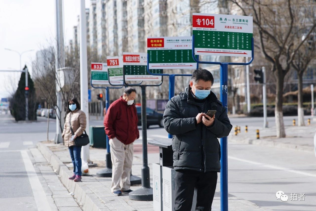 △ 2月18日,天通苑社区,在天通北苑二区南公交车站等车的市民。