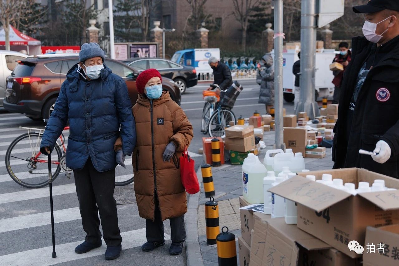 △ 2月19日,天通苑社区立水桥北路,一名商家购进了几箱消毒液在路旁售卖,路过的市民驻足打量。