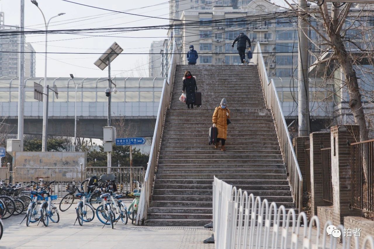 △ 2月19日,天通苑社区,行人提着行李箱走过人行天桥。