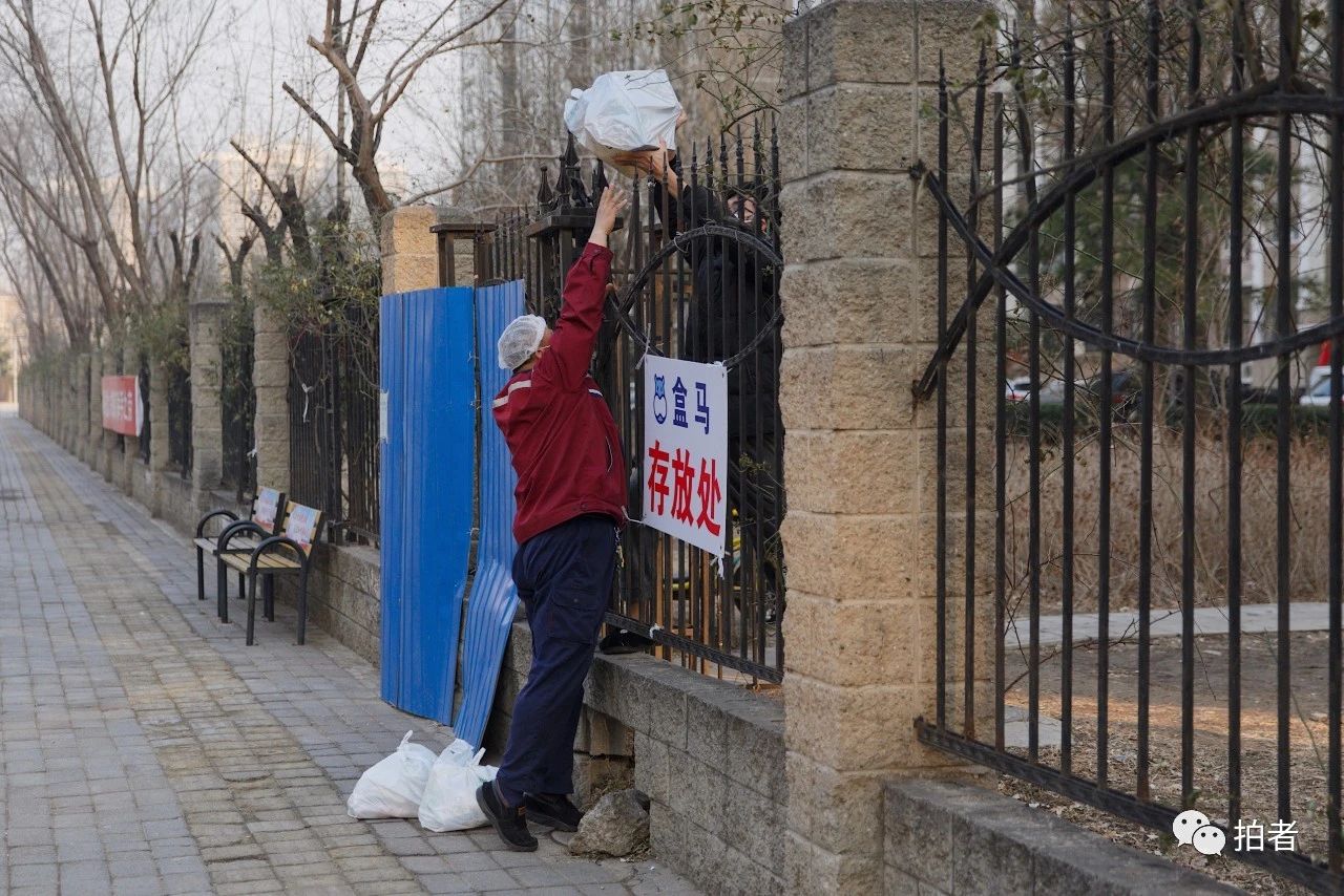 △ 2月19日,天通苑北二区,一名生鲜配送员刚配送完准备离开,另一名生鲜配送员接踵而来。疫情期间,天通苑的生鲜配送需求很大。