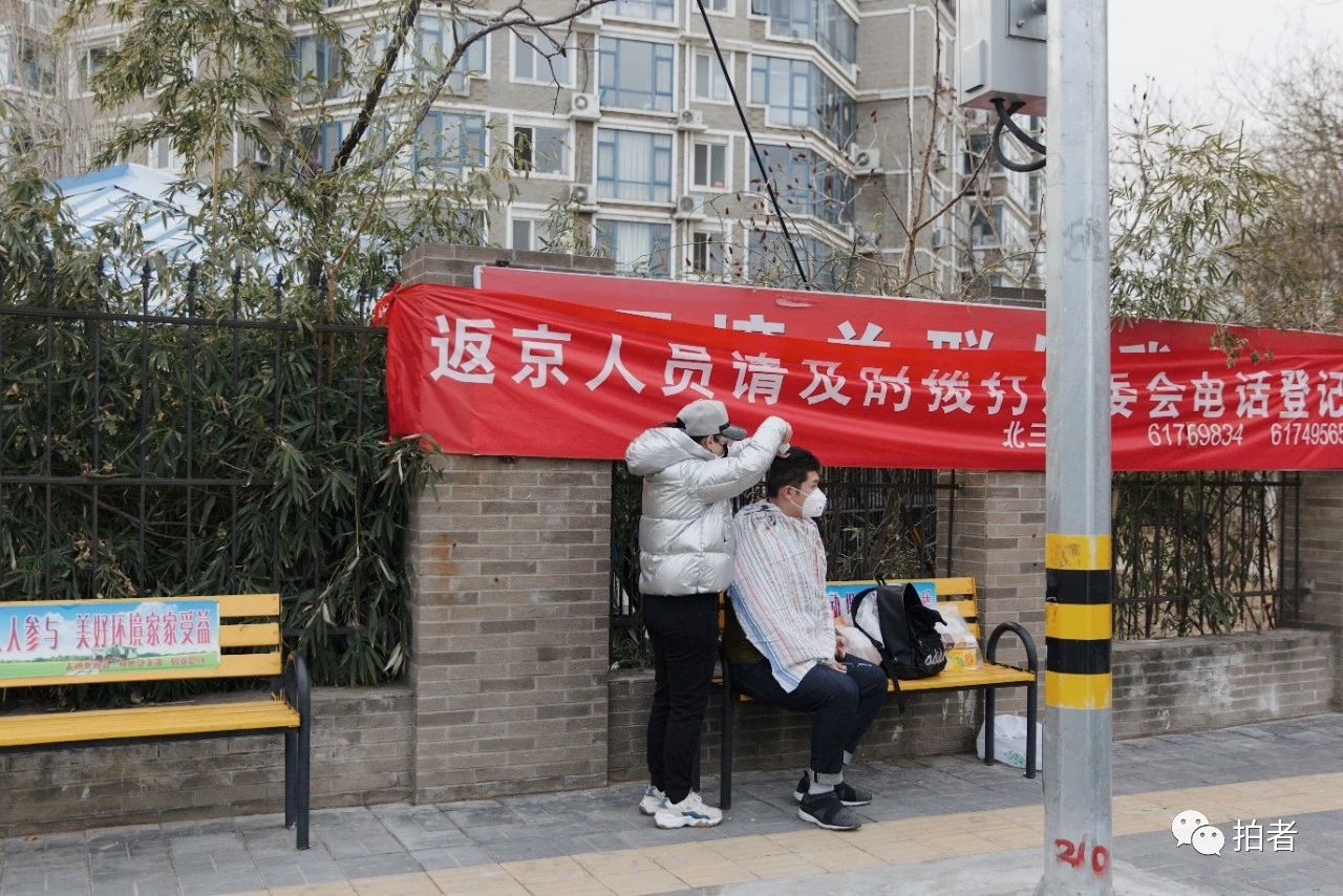 △ 2月18日,天通苑北三区,由于附近没有理发店营业,小区住户自行修剪头发。