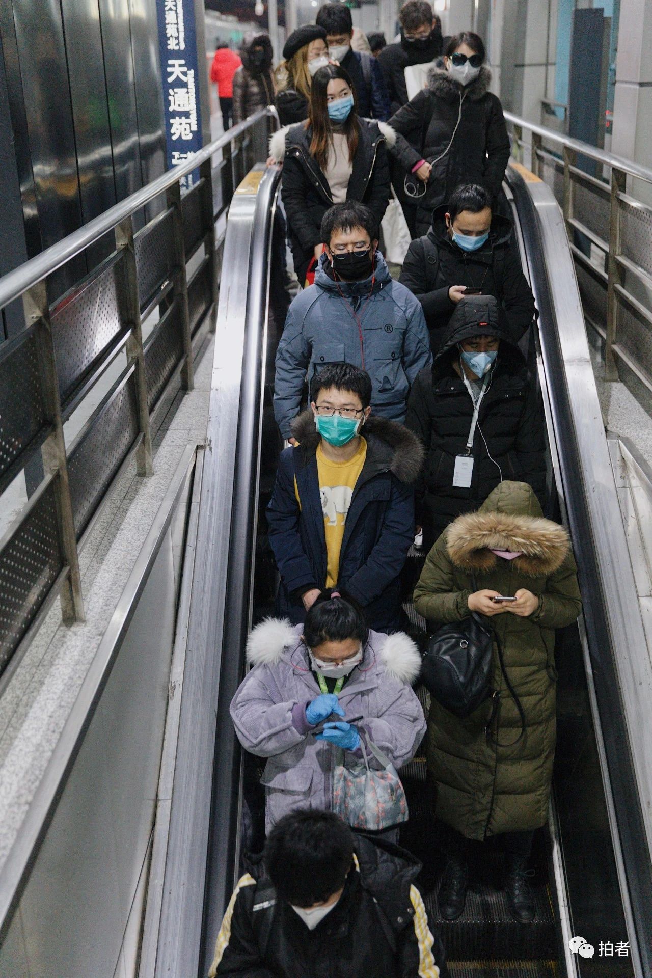 △ 2月19日,晚高峰时段,地铁五号线天通苑站,戴着口罩的出站乘客。