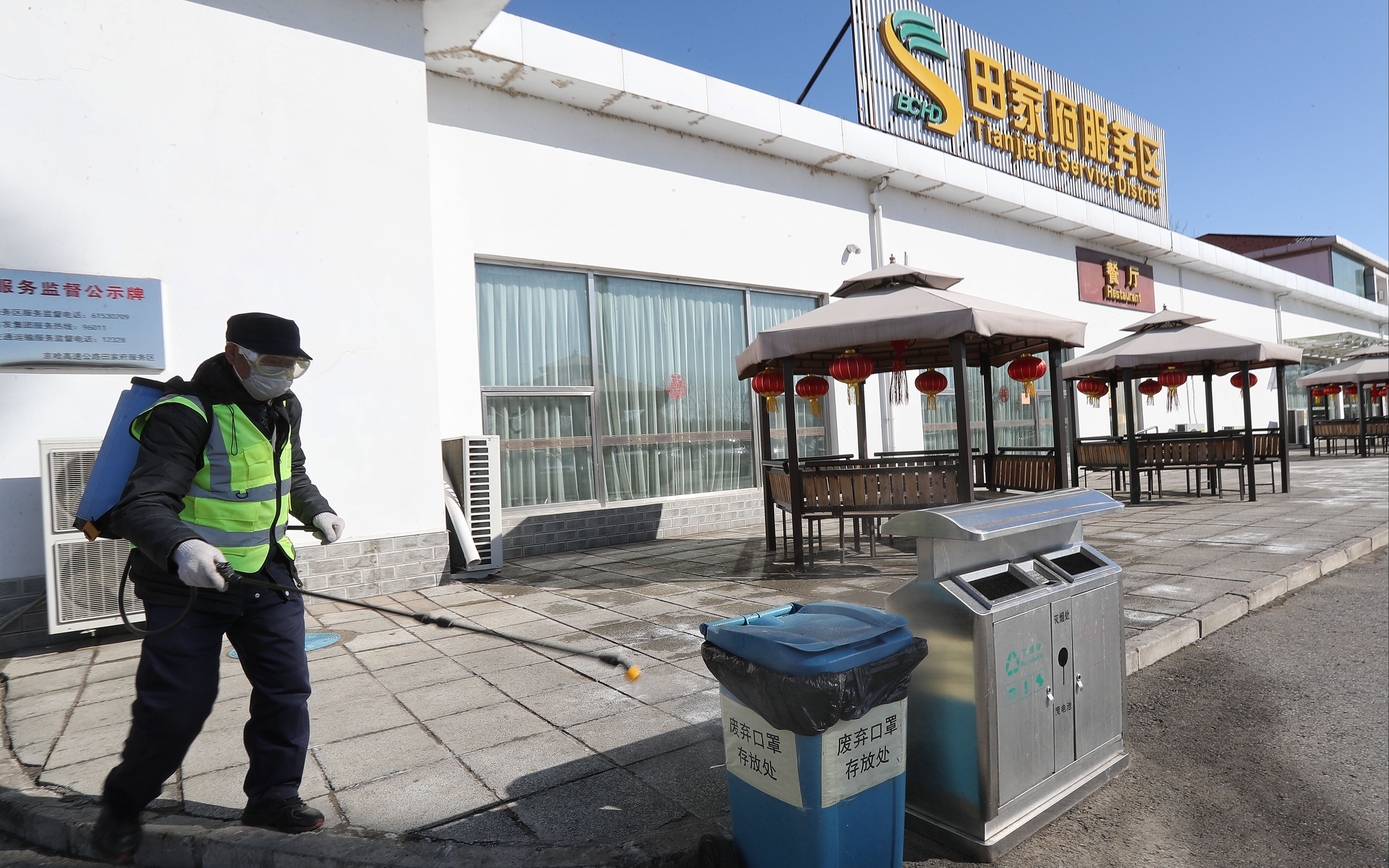 疫情期间,通州区田家府服务区公共场所每天进行不少于4次的消毒,并设置废弃口罩专用垃圾箱。摄影/新京报记者 王贵彬