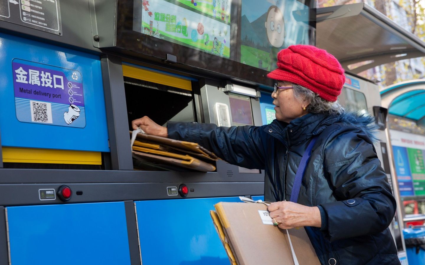 2019年11月25日,东城区新怡家园,居民将可回收垃圾投入智能垃圾桶内。这部分垃圾经过称重,可以转换成积分,积分可用于兑换商品。摄影/新京报记者 李凯祥