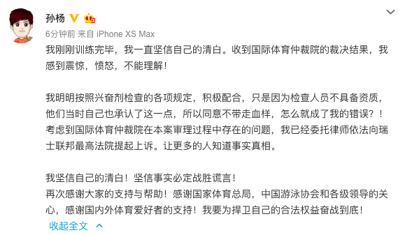 孙杨在微博中写道:“考虑到国际体育仲裁院在本案审理过程中存在的问题,我已经委托律师依法向瑞士联邦最高法院提起上诉。”