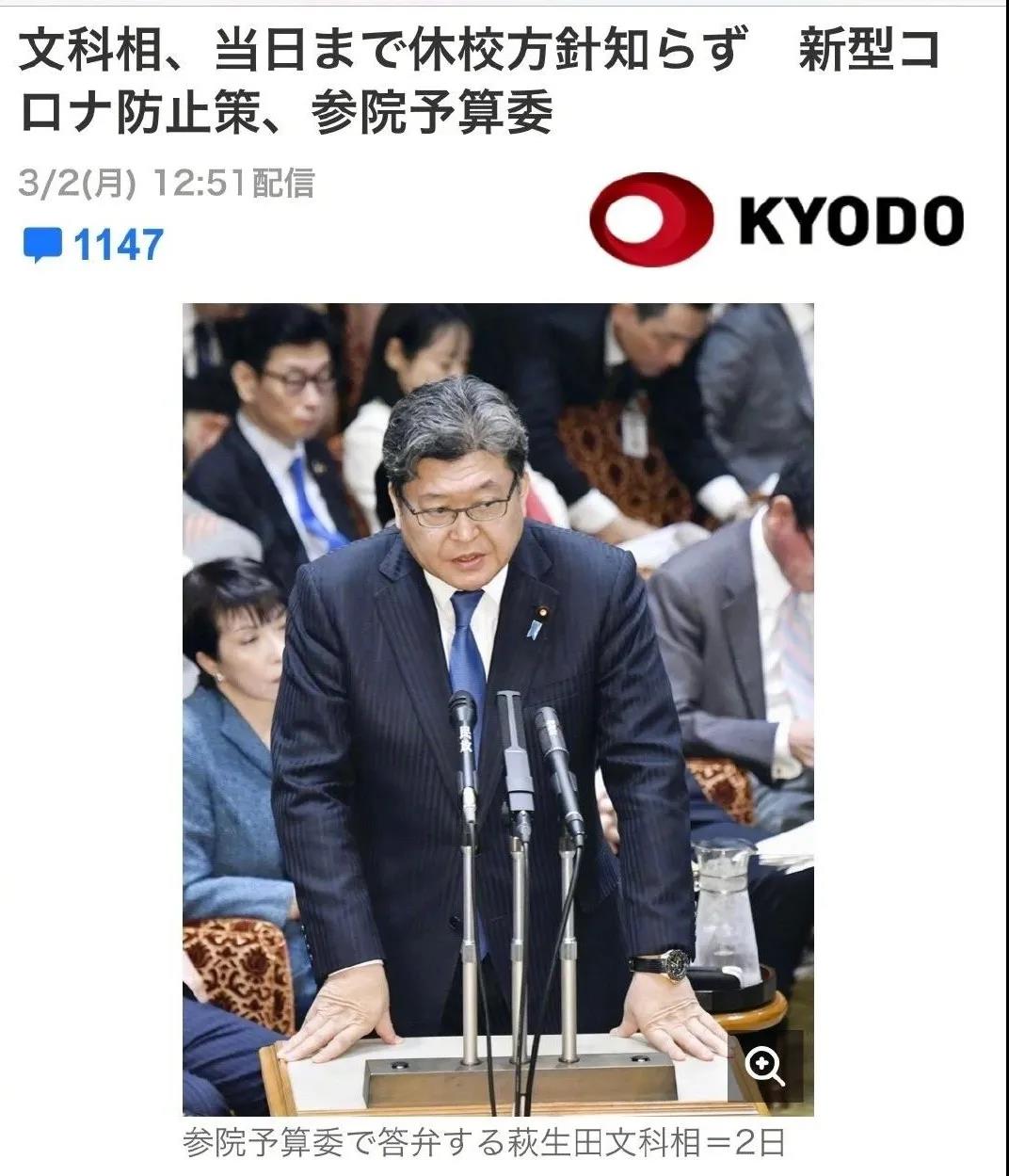 3月2日是安倍晋三要求全国小、初、高停课的第一天,但是日本国内对这一决定出现不少质疑声音,京都则不顾首相指令,要求中小学继续上课。据共同社报道,在3月2日的参院预算委员会上,在野党指出,全国停课通知没有预先通过教育系统讨论,导致学校教师措手不及,议员就此事质询文部科学大臣萩生田光一。萩生大臣表示:“我也是安倍开记者会当天才知道。”