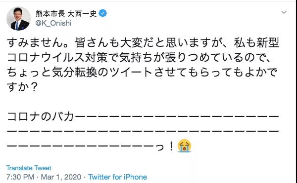 也有日本官员为缓解紧张氛围“卖萌”。熊本市长大西一史3月1日在推特上发文称:“不好意思,明白大家处境艰难。为了应对新冠肺炎疫情,我的情绪也一直非常紧绷,我在这里发个推特转化下情绪可以吗?新冠病毒你这个大笨蛋!”这条推特在24小时内收获了超过32万个点赞,大西一史变身“网红市长”。网友纷纷留言,感谢市长辛劳付出,希望他保重身体。