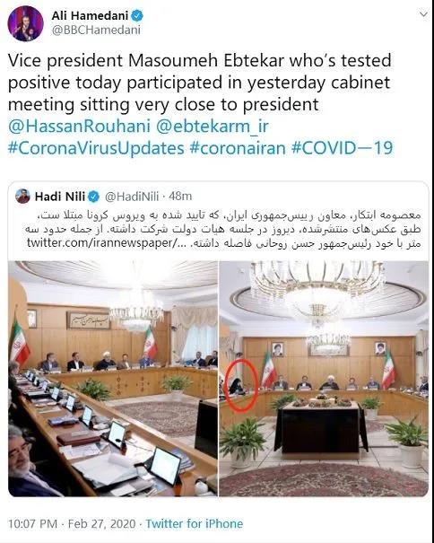 截至3月2日,伊朗至少8名高官感染新冠肺炎,其中伊朗副总统玛苏梅·埃卜特卡尔级别最高。在埃卜特卡尔确诊的前一天,她曾和总统以及多位部长级官员一起召开会议,从照片来看,埃卜特卡尔同鲁哈尼的距离十分近。