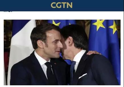马克龙与孔特贴面礼。/CGTN报道截图