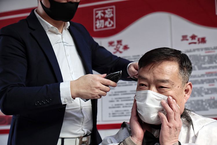 为了方便理发师修剪鬓角,一名理发人员摘下口罩耳带,用手护住口罩。