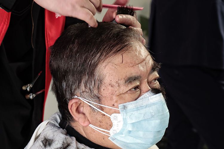 理发师志愿者为疫情防控一线工作人员修剪头发。