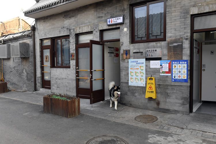 秦老胡同,一只“二哈”大摇大摆地从公厕中走出来。