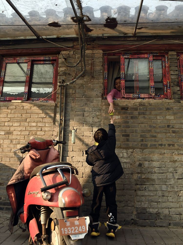 秦老胡同,姐姐通过后窗户给在外面的弟弟递水。